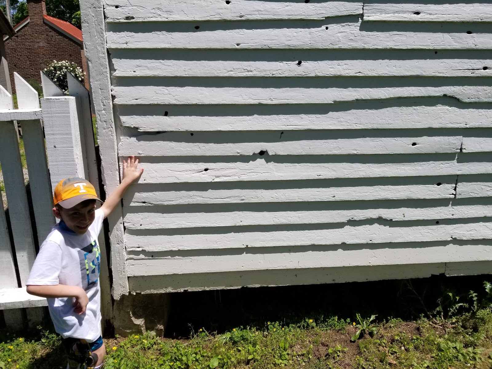 | My grandson Russell Qualls pointing to the bullet in the post |